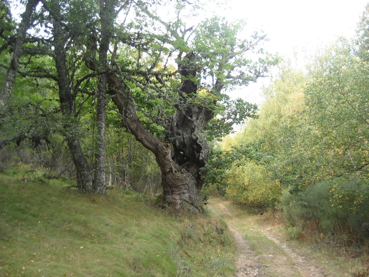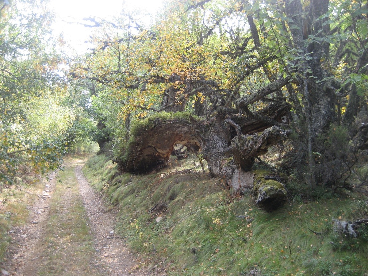 Descripción de la ruta: Por la carretera general, en Rioscuro tomaremos el desvío a LE-493 al Villar de Santiago. En el punto marcado con un panel informativo, dejamos el coche y empezamos la ruta andando. Veremos a mano derecha un camino que nos llevará a cruzar el arroyo que viene del Villar. El camino va ascendiendo sin mucha dificultad atravesando un frondoso bosque de robles, avellanos, fresnos hasta una última zona de prados, aquí ya divisaremos la primera cabaña de la braña de Brañarronda; es una cabaña robusta y en un excelente estado de conservación. Aquí tomaremos el camino de la derecha con una pequeña pendiente hasta alcanzar la segunda cabaña. Continuamos el ascenso hasta una bifurcación donde debemos tomar el camino de la izquierda. En un primer tramo llano encontraremos una fuente y ya accederemos al corazón del bosque de Brañarronda, de una gran belleza. A mano izquierda veremos el arroyo en el que se forman varios saltos de agua y pequeñas cascadas. Tras un ligero ascenso contemplaremos un petroglifo y los tejos. Los tejos son ejemplares de gran porte, algunos con más de 7 metros de diámetro y 15 metros de altura; estos datos nos indican que tienen más de 1000 años de antigüedad.