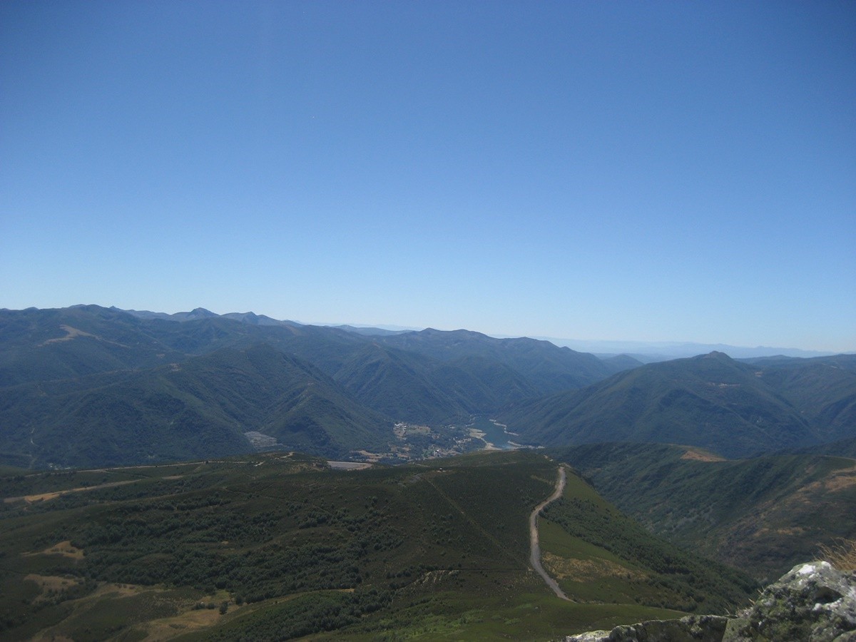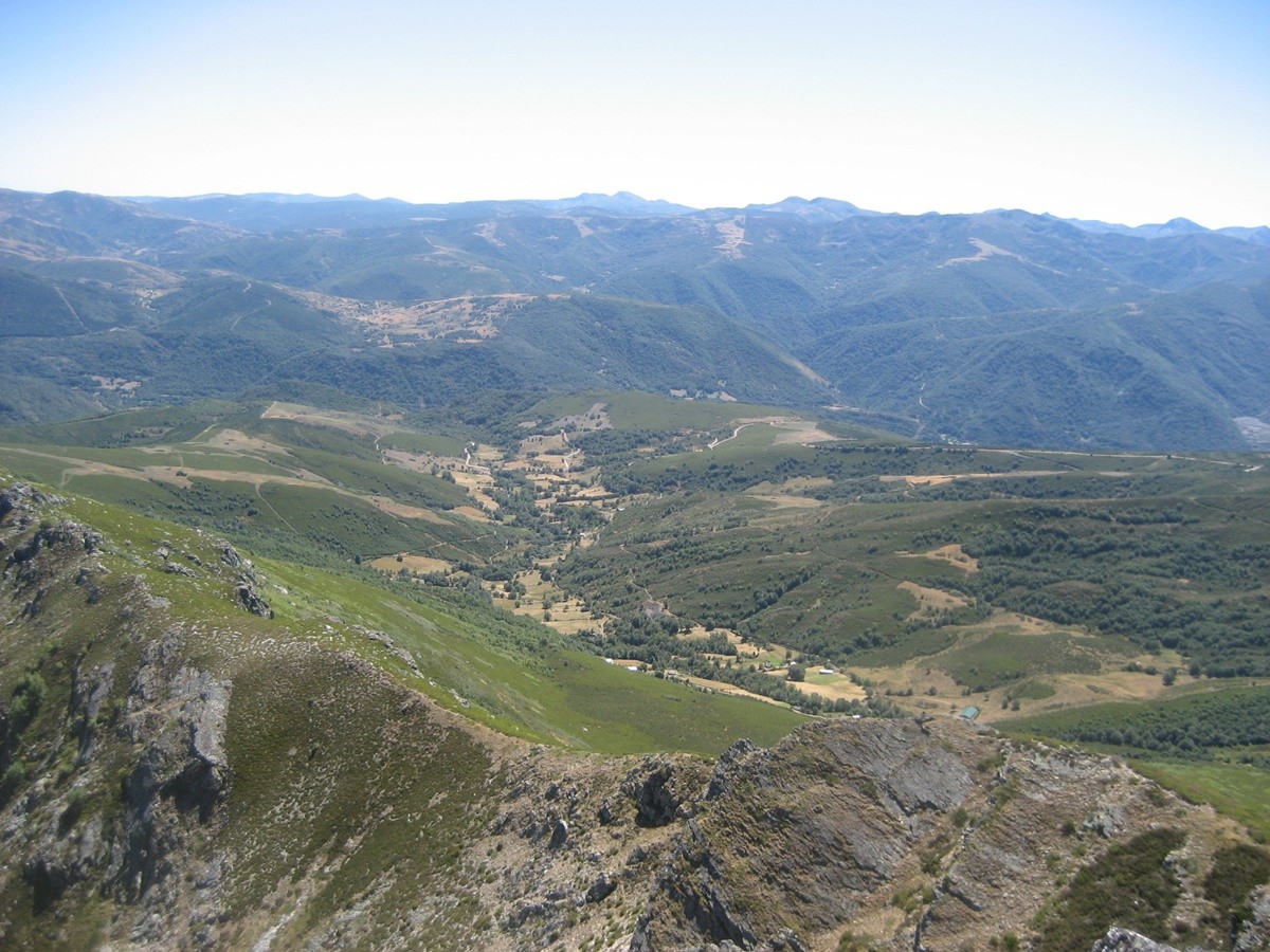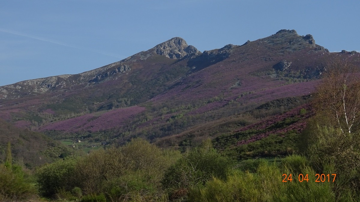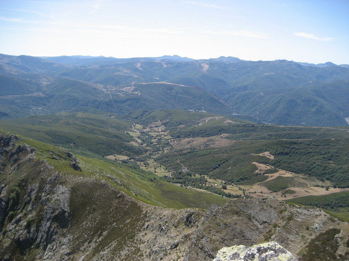 Desde la laguna del Castro continuamos por la pista de tierra y sin ninguna pendiente pronto alcanzaremos las cabañas de la braña de Villaseca. Seguimos andando hasta llegar a un cruce, tomamos el desvío a la izqda y enseguida llegamos a las cabañas de la braña de Robles. Continuamos hasta un paraje en el que destaca un recinto para el ganado y una fuente abrevadero , en este punto atravesamos por la derecha una pradera para tomar un sendero con una cierta inclinación y rodeado de retamas y pequeños árboles, para más adelante adentrarnos en otra sin vegetación que nos lleva a la cumbre del Muxivén con poste geodésico.