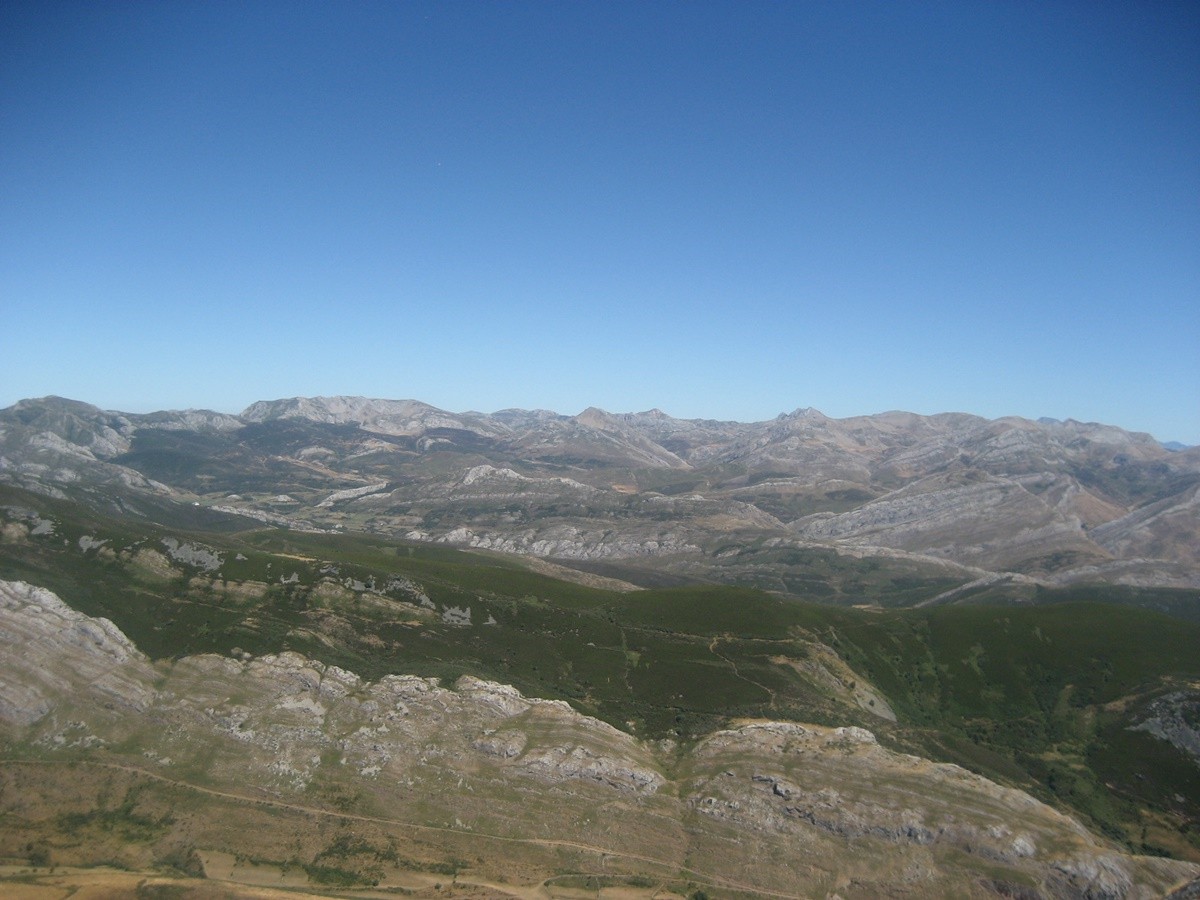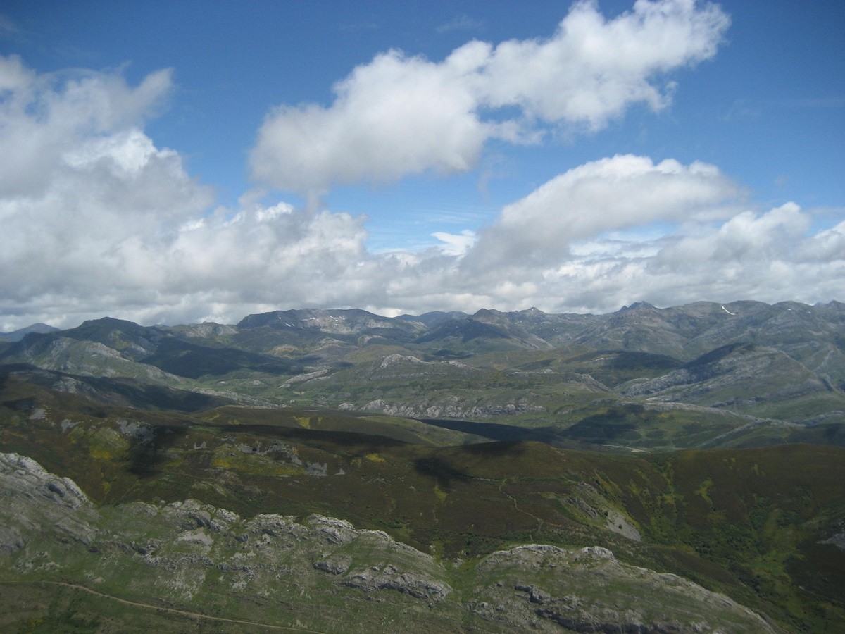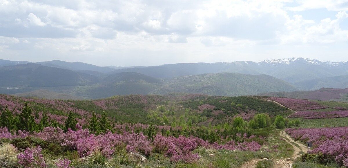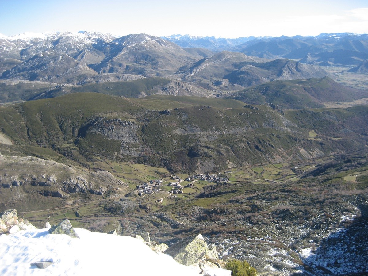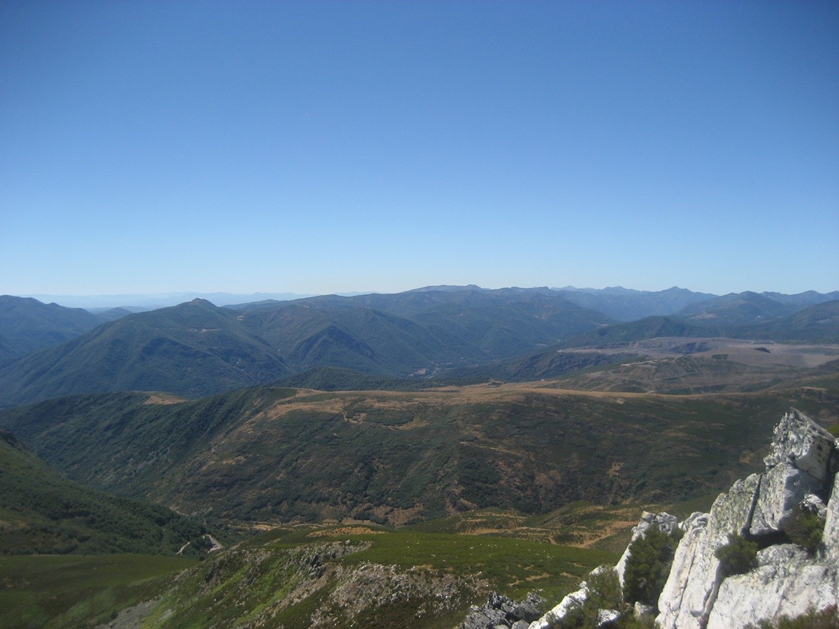 Desde la laguna del Castro continuamos por la pista de tierra y sin ninguna pendiente pronto alcanzaremos las cabañas de la braña de Villaseca. Seguimos andando hasta llegar a un cruce, tomamos el desvío a la izqda y enseguida llegamos a las cabañas de la braña de Robles. Continuamos hasta un paraje en el que destaca un recinto para el ganado y una fuente abrevadero , en este punto atravesamos por la derecha una pradera para tomar un sendero con una cierta inclinación y rodeado de retamas y pequeños árboles, para más adelante adentrarnos en otra sin vegetación que nos lleva a la cumbre del Muxivén con poste geodésico.
